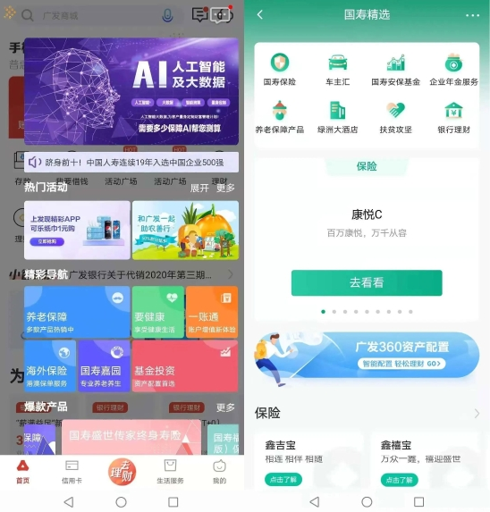 作为中国人寿集团成员单位,广发银行以“打造国内首屈一指的保险业金融服务商”为目标,深入落实“重振国寿”战略,挖潜综合金融优势。手机银行作为连接保险、银行、客户的主渠道,推出国寿精选专区,集成集团保险、基金、养老保障等产品,打造集寿险、财险、养老保障、基金、年金服务、电商扶贫等为一体的综合金融服务专区。